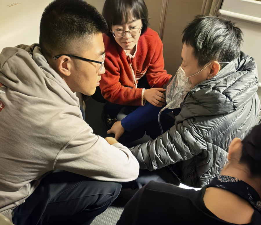 在机舱狭小的空间内,一场争分夺秒的救护迅即展开。乘务员迅速取来机上急救包和便携式氧气瓶,让乘客平卧吸氧。三位重症医学专家轮流为其监测血压、心率与血氧饱和度,乘务组则全程陪护,每10分钟详细记录一次生命体征数据。